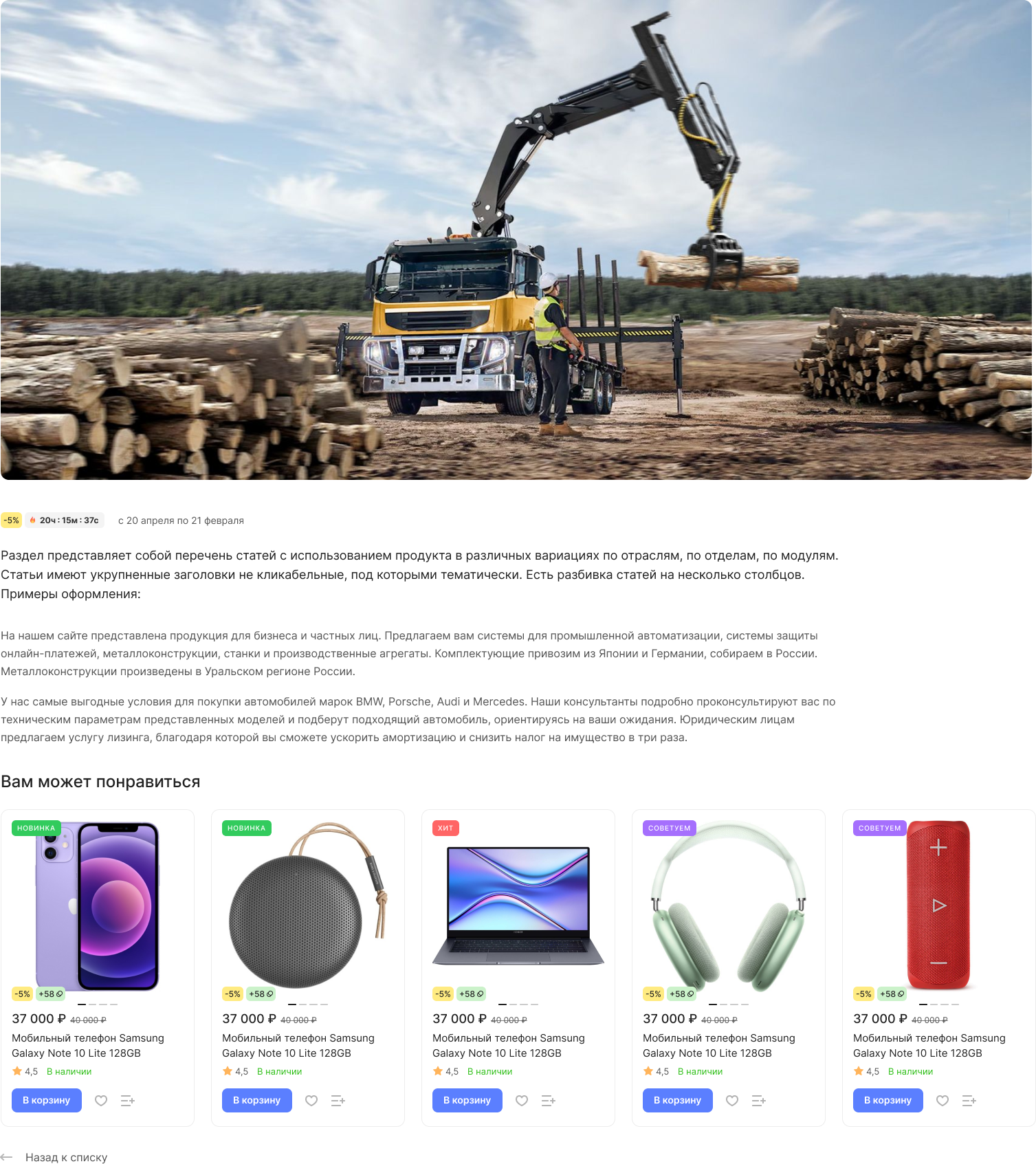 Устанавливайте готовые тематики или выбирайте конфигурации. Они помогут быстро запустить сайт. Продумано все — структура, расположение баннеров, вид списка, отображение карточки товара и текст.